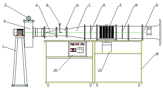 1、風(fēng)機支架 2、風(fēng)機 3、風(fēng)量調(diào)節(jié)手輪 4、過渡管 5、測壓管 6、測速段 7、過渡管 8、測壓管 9、實驗管段 10、測壓管 11、吸入管 12、支架 13、加熱元件 14、控制盤