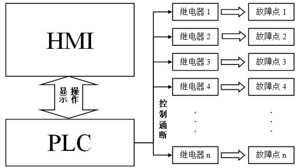以上述維修電工故障排查考核實訓裝置的升級改造為例,本文以其中“CA6140型臥式車床”的考核裝置(原電路有11個故障點)展開闡述。該套方案是將原有考核實訓裝置上的操作按鈕升級為HMI組態(tài)棒圖,故障設(shè)置開關(guān)替換為繼電器,并加裝可編程處理器(PLC),實現(xiàn)故障設(shè)置和故障判斷的邏輯控制,組成一套智能電氣控制系統(tǒng),整體如圖2所示。系統(tǒng)同時具備練習模式和考核模式,其中考核模式具有賬戶管理功能和掉電記錄功能,有更好的操作性和保密性,便于開展故障排查綜合實訓和技能鑒定。