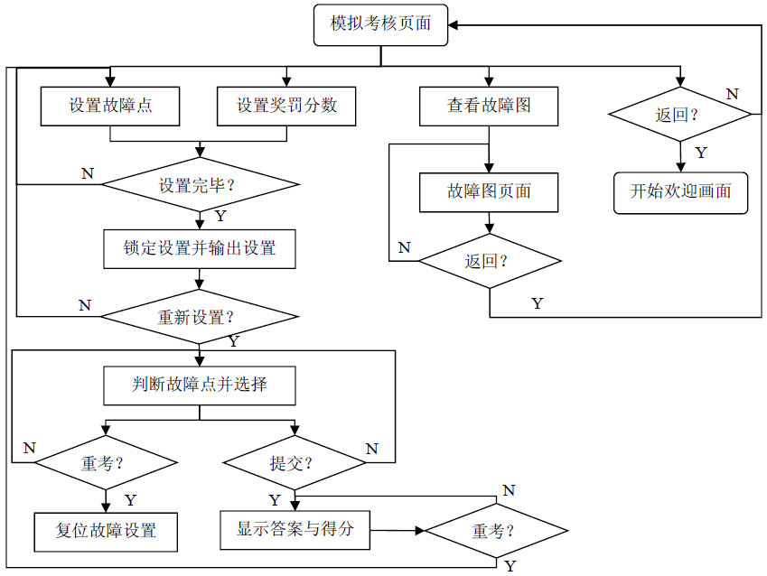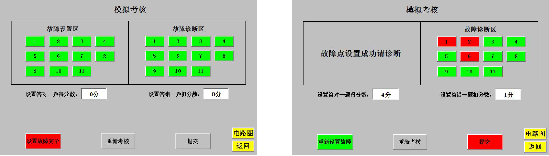 在該模式下,教師/學生設(shè)置完故障點和獎罰分數(shù)(鎖定前可修改),提交后控制系統(tǒng)鎖定設(shè)置并輸出故障信息,如有修改需求可清零設(shè)置。然后交給考試判斷,考生判斷電路后輸入答案(提交前可修改),提交后系統(tǒng)將鎖定選擇,給出分數(shù),并提供實際故障點用于與診斷結(jié)果對比。在練習過程,考生可隨時點開電路圖查看電路。練習完畢,教師/學生可復位重新開始。流程如圖6展示。