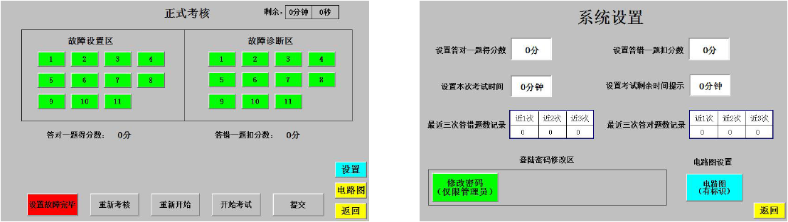 為了應(yīng)對綜合實訓與技能鑒定兩種不同場合的實際使用情況,考核模式的操作權(quán)限設(shè)置“教師(考評員)”與“管理員”兩種不同的用戶組,分別對應(yīng)不同的密碼。其中對故障設(shè)置、故障判斷、系統(tǒng)設(shè)置和返回功能的操作權(quán)限對兩個用戶組均開放。其中修改密碼權(quán)限僅對“管理員”用戶組開放,且“管理員”用戶組不僅能修改本組操作密碼,亦能修改“教師”用戶組的密碼,避免教師間修改密碼缺乏溝通或者學生掌握密碼后隨意修改導致密碼丟失。