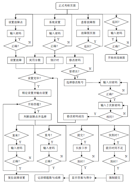 該模式下,只有教師(考評員)/管理員可以登錄,登錄需驗證密碼。部分按鈕的操作亦需要密碼驗證。不同的賬戶登錄,需要驗證不同的密碼。其中管理員賬號還具有修改密碼權(quán)限。其余操作與練習模式基本一致。流程如圖7展示。