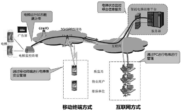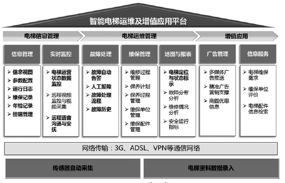 利用物聯(lián)網(wǎng)技術(shù),通過(guò)安裝物聯(lián)網(wǎng)的外接傳感器采集電梯的各種數(shù)據(jù),包括運(yùn)營(yíng)、故障和維修等信息,通過(guò)網(wǎng)絡(luò)將信息數(shù)據(jù)傳輸?shù)诫娞葸\(yùn)營(yíng)管理平臺(tái),實(shí)現(xiàn)電梯管理方、電梯維修方和電梯監(jiān)管部門等對(duì)電梯的全方位管理,打造電信維修及保養(yǎng)信息撮合平臺(tái)。