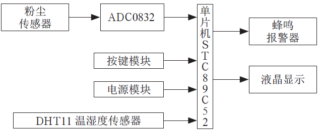 本次設(shè)計,結(jié)構(gòu)組件包含了AD 數(shù)據(jù)采集、STC89C51型號單片機、報警控件、煙霧感應(yīng)組件等?傮w框圖如圖2所示。