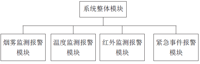 本次系統(tǒng)包含煙霧監(jiān)測、溫度監(jiān)測、紅外監(jiān)測、緊急事件四大報警功能模塊。