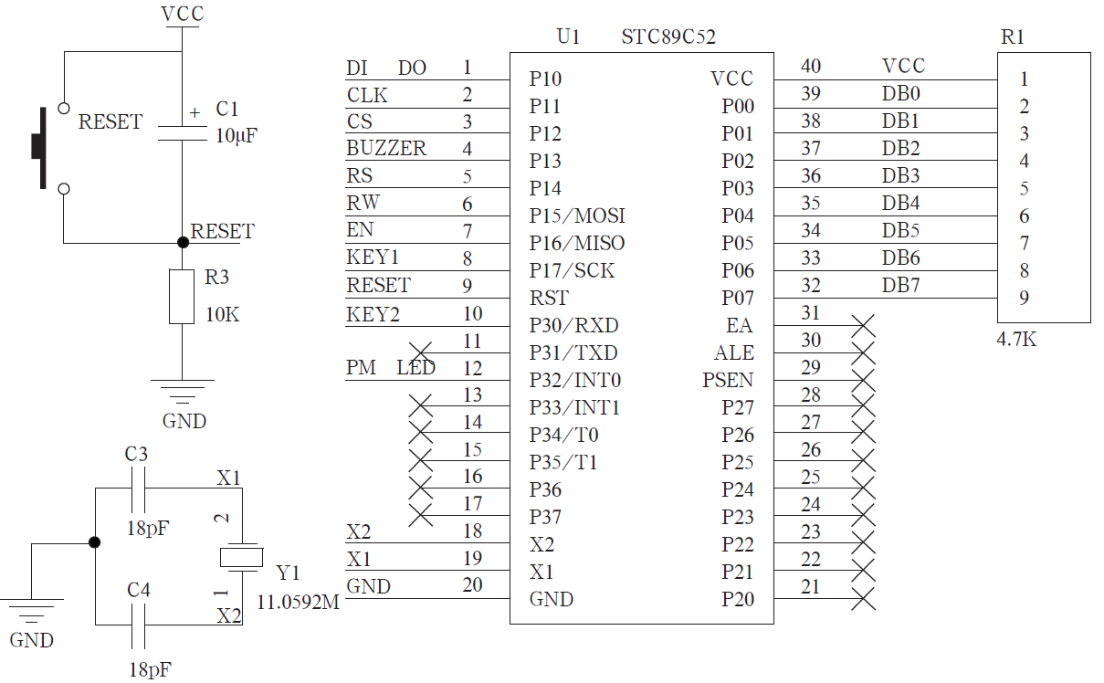 本次設(shè)計中單片機主控電路示意圖如圖4 所示。針對智能防盜防火報警系統(tǒng)的設(shè)計,最小系統(tǒng)包括單片機時鐘電路和復(fù)位電路。