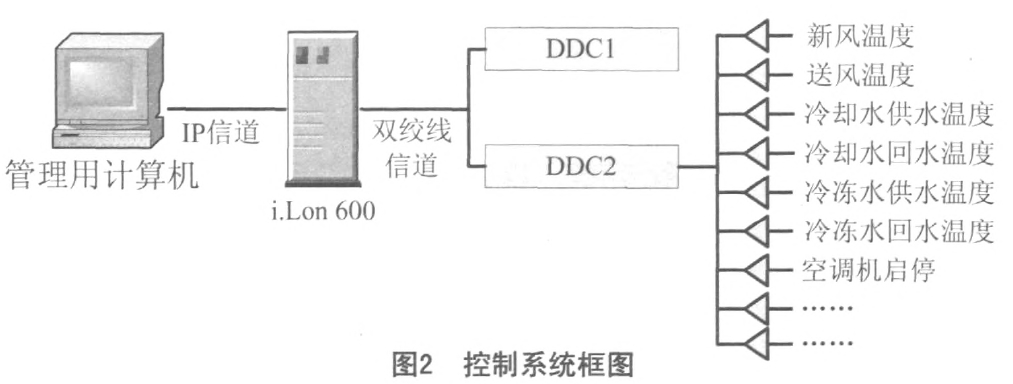 圖5空調(diào)水系統(tǒng)監(jiān)控原理圖中有兩個循環(huán)系統(tǒng),每個循環(huán)系統(tǒng)都連有進出冷水機組側(cè)的溫度傳感器,水泵和電動閥。冷水溫度的控制是根據(jù)室內(nèi)溫度傳感器的反饋信息來經(jīng)DDC計算控制水閥的開度進而控制冷水的溫度。