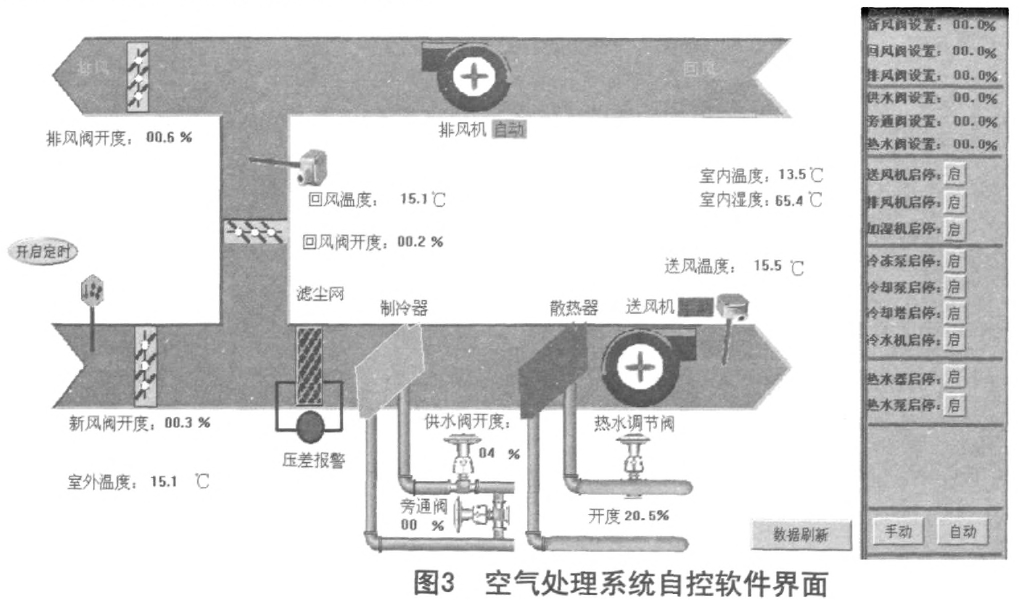 系統(tǒng)運行時有兩種控制狀態(tài):自動控制狀態(tài)和手動控制狀態(tài)。當選擇自動控制模式時,通過傳感器檢測到的模擬房間溫度、風系統(tǒng)溫度、水系統(tǒng)溫度以及壓差信號作為反饋,根據(jù)控制算法實時地控制電動閥、壓差開關、電動風閥,從而使模擬房間的溫度、新風量達到目標值。當選擇手動控制模式時,所有控制用電動閥、壓差開關、電動風閥的控制都由操作人員直接用鼠標點擊操作的方式進行控制。其中空氣處理系統(tǒng)自控軟件界面如圖3所示。