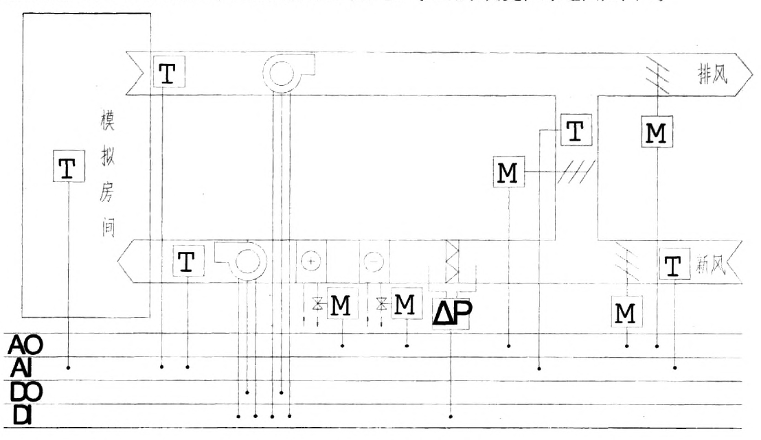 圖4上方風管為回風管,下方風管為送風管,回風管中裝有同風機,送風管中裝有過濾網(wǎng)、加熱器、表冷器、送風機;T表示溫度傳感器,可以分別監(jiān)測回風管、送風鋝、模擬房間、新風側(cè)溫度;H表示電動閥,可以分別:|在測和控制新風、排風、混合段電動風閥及表冷器、加熱器電動閥的開度;△P表示壓差開關,當空氣過濾網(wǎng)上灰塵增多時,通過時空氣阻力增大,將影響空調(diào)的正常運行,此時濾網(wǎng)兩端壓差增大,對其兩邊設置壓差監(jiān)測?梢詫V網(wǎng)狀態(tài)進行監(jiān)測。圖中5個電動閥連接至DDC的模擬輸出(AO)端口,5個溫度傳感器連接至DDC的模擬輸入(AI)端口,送風機與同風機由DDC的數(shù)字輸出(DO)端口控制,2臺風機的丌啟狀態(tài)和濾網(wǎng)壓差由DDC的數(shù)字輸入(DI)端口監(jiān)控。