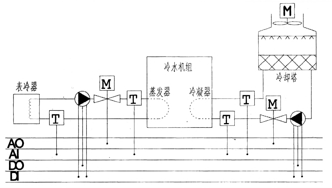 對空調(diào)水系統(tǒng)進行監(jiān)控制的主要要求有:1.保證冷水機組蒸發(fā)器側(cè)有足夠的水量使蒸發(fā)器正常工作:2.冷水機組可以向空調(diào)機組的表冷器提供足夠的冷水量以滿足使用要求;3.保證冷水機組冷凝器側(cè)有足夠的冷卻水通過;4.保證冷卻塔風機和各水泵的安全運行?照{(diào)水系統(tǒng)監(jiān)控原理圖如圖5。