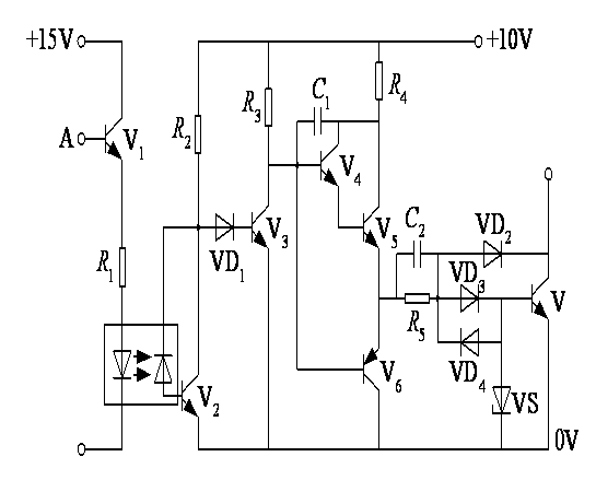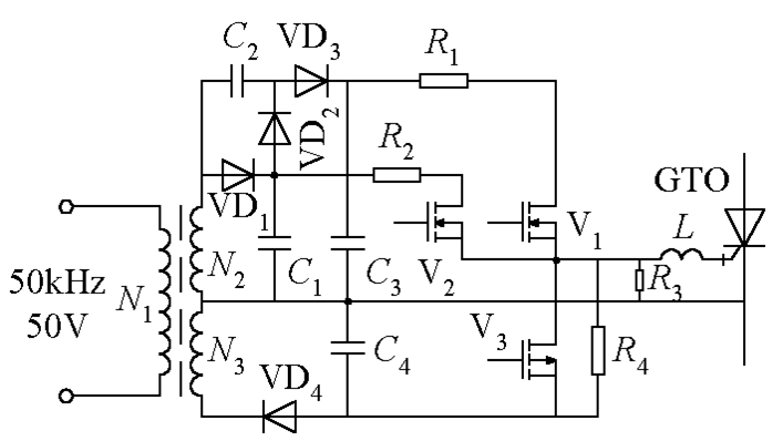 √V2關(guān)斷而V3開通時輸出負(fù)脈沖;V3關(guān)斷后R3和R4提供門極負(fù)偏壓。