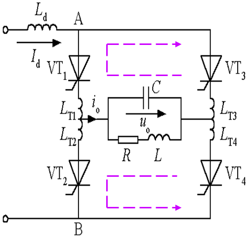 1.由四個橋臂構成,每個橋臂的晶閘管各串聯一個電抗器,用來限制晶閘管開通時的di/dt。