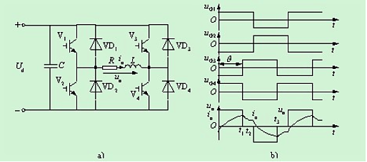 2.電路中開關器件的作用僅是改變直流甩流的流通路徑,因此交流側輸出電流為矩形波,并且與負載阻抗角無關。而交流側輸出電壓波形和相位則因負載阻抗情況的不同而不同。