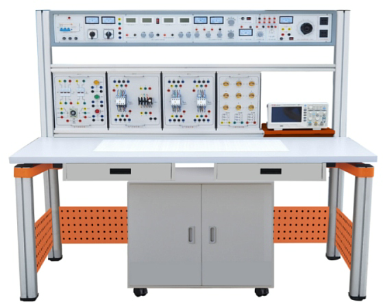裝置由主機箱、實驗桌、實訓屏、實訓掛箱、移動矮柜、示波器架、學生凳等組成。實訓裝置支架與實訓桌可組合、可拆裝。支架與桌腳一體,鋁合金結構,實訓掛箱、各實驗模塊可根據實驗需求自由組合放置。