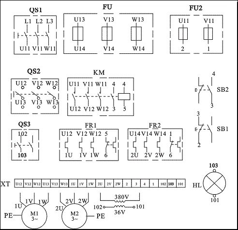 | M1、M2 | 三相鼠籠異步電動機 |