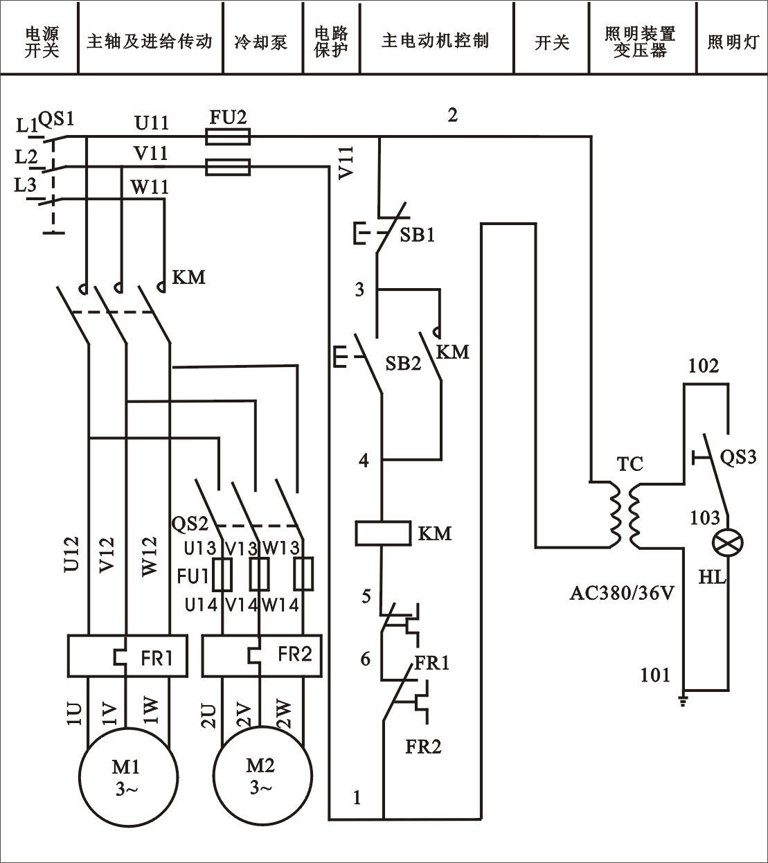接觸器KM的線圈通電而鐵心吸合,主回路中接觸器KM的三個常開觸頭合上,主電機M1得到三相交流電而起動運轉,同時接觸器KM的常開輔助觸頭也合上,對控制回路進行自鎖,保證起動按鈕SB2松開時,接觸器KM的線圈 仍然通電。若加工時需要冷卻,則撥動開關QS2,讓冷卻泵電動機M2通電運轉,帶動冷卻泵供應冷卻液。