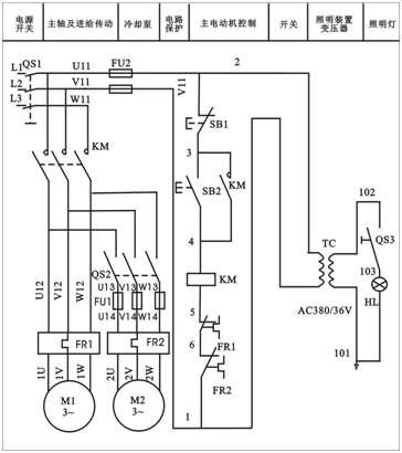,接觸器KM的線圈通電而鐵心吸合,主回路中接觸器KM的三個常開觸頭合上,主電機(jī)M1得到三相交流電而起動運轉(zhuǎn),同時接觸器KM的常開輔助觸頭也合上,對控制回路進(jìn)行自鎖,保證起動按鈕SB2松開時,接觸器KM的線圈 仍然通電。若加工時需要冷卻,則撥動開關(guān)QS2,讓冷卻泵電動機(jī)M2通電運轉(zhuǎn),帶動冷卻泵供應(yīng)冷卻液。