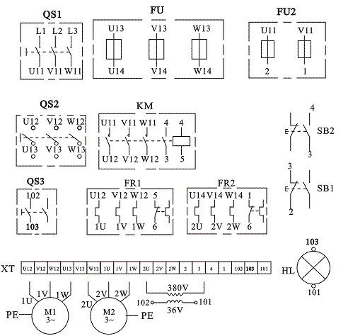 | M1、M2 | 三相鼠籠異步電動機(jī) |