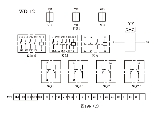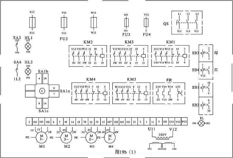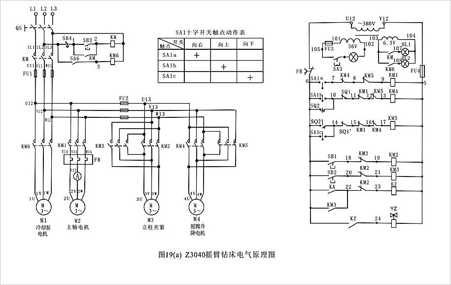 (1) 主電路分析 本機床的電源開關采用接觸器KM,具有零壓保護和欠壓保護作用。從圖19(a)中可看出,搖臂鉆床共有四臺電動機。主電動機M2由主接觸器KM1控制,單向旋轉,主軸正反轉由機械手柄操作。電動機M3是立柱放松和夾緊電動機。用接觸器KM2和KM3控制。M4是搖臂升降電動機,用接觸器KM4和KM5控制。M1是冷卻泵電動機。