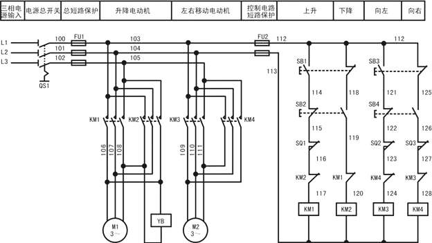 (2) M2是左右移動電動機(jī),由接觸器KM3,KM4控制正反轉(zhuǎn)實(shí)現(xiàn)左右移動;