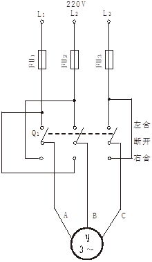 1合向“斷開”位置后,再扳向“右合”位置,觀察電機轉向。