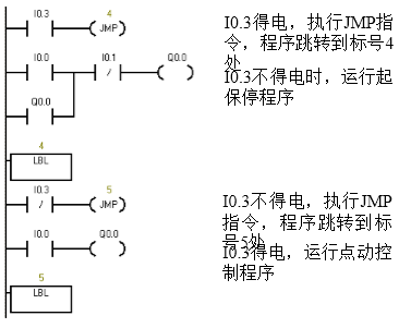 設(shè)I0.3為點動/連動控制選擇開關(guān),當I0.3得電時,選擇點動控制;當I0.3不得電時,選擇連續(xù)運行控制。采用跳轉(zhuǎn)指令控制的點動/連動控制程序如下圖所示