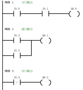 撥動(dòng)輸入開(kāi)關(guān)I0.2、I0.3、I0.4,觀察輸出指示燈Q0.1、Q0.2是否符合與、或、非邏輯的正確結(jié)果。