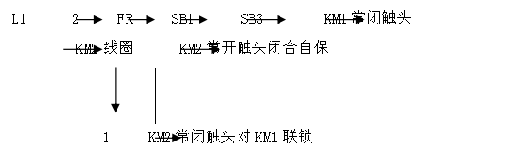 (2)反轉(zhuǎn)控制 要使電動機(jī)改變轉(zhuǎn)向(即由正轉(zhuǎn)變?yōu)榉崔D(zhuǎn))時,應(yīng)先按下停止按鈕SB1,使正轉(zhuǎn)控制電路斷開,電動機(jī)停轉(zhuǎn),然后才能使電動機(jī)反轉(zhuǎn),為什么要這樣操作呢?因為反轉(zhuǎn)控制回路中串聯(lián)了正轉(zhuǎn)接觸器KM1的常閉觸頭。當(dāng)KM1通電工作時,它是斷開的,若這時直接按反轉(zhuǎn)按鈕SB3,反轉(zhuǎn)接觸器KM2是無法通電的,電動機(jī)也就得不到電源,故電動機(jī)仍然處在正轉(zhuǎn)狀態(tài),不會反轉(zhuǎn),當(dāng)先按下停止按鈕SB1,使電動機(jī)停轉(zhuǎn)以后,再按下反轉(zhuǎn)按鈕SB3,電動機(jī)才會反轉(zhuǎn)。這時,反轉(zhuǎn)控制線路為: