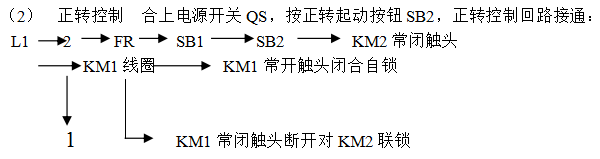 接觸器KM1的線圈通電動(dòng)作,主觸頭閉合,主電路按U1、V1、W1相序接通,電動(dòng)機(jī)正轉(zhuǎn)。