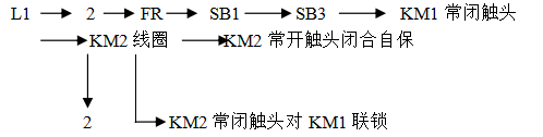 (2)反轉(zhuǎn)控制 要使電動(dòng)機(jī)改變轉(zhuǎn)向(即由正轉(zhuǎn)變?yōu)榉崔D(zhuǎn))時(shí),應(yīng)先按下停止按鈕SB1,使正轉(zhuǎn)控制電路斷開,電動(dòng)機(jī)停轉(zhuǎn),然后才能使電動(dòng)機(jī)反轉(zhuǎn),為什么要這樣操作呢?因?yàn)榉崔D(zhuǎn)控制回路中串聯(lián)了正轉(zhuǎn)接觸器KM1的常閉觸頭。當(dāng)KM1通電工作時(shí),它是斷開的,若這時(shí)直接按反轉(zhuǎn)按鈕SB3,反轉(zhuǎn)接觸器KM2是無(wú)法通電的,電動(dòng)機(jī)也就得不到電源,故電動(dòng)機(jī)仍然處在正轉(zhuǎn)狀態(tài),不會(huì)反轉(zhuǎn),當(dāng)先按下停止按鈕SB1,使電動(dòng)機(jī)停轉(zhuǎn)以后,再按下反轉(zhuǎn)按鈕SB3,電動(dòng)機(jī)才會(huì)反轉(zhuǎn)。這時(shí),反轉(zhuǎn)控制線路為: