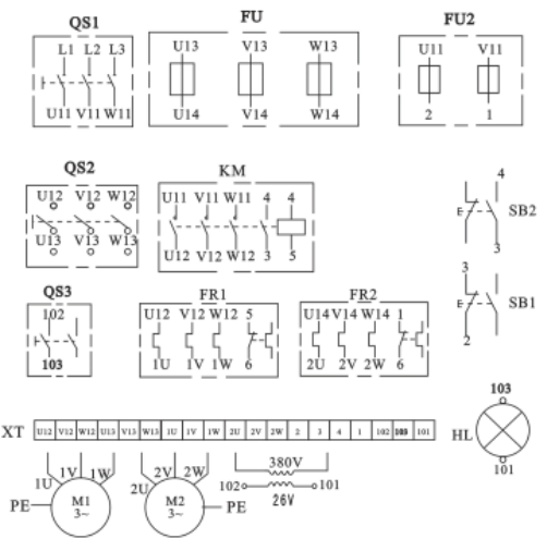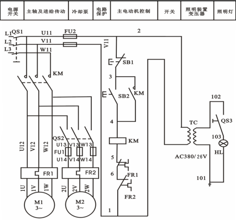 。接觸器KM的線圈通電而鐵心吸合,主回路中接觸器KM的三個常開觸頭合上,主電機M1得到三相交流電而起動運轉(zhuǎn),同時接觸器KM的常開輔助觸頭也合上,對控制回路進行自鎖,保證起動按鈕SB2松開時,接觸器KM的線圈 仍然通電。若加工時需要冷卻,則撥動開關QS2,讓冷卻泵電動機M2通電運轉(zhuǎn),帶動冷卻泵供應冷卻液。