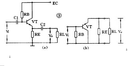 ( 3 )射極輸出器圖 3 ( a )是一個射極輸出器。它的輸出電壓是從射極輸出的。圖 3 ( b )是它的交流通路圖,可以看到它是共集電極放大電路。