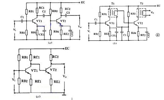這個圖中,晶體管真正的輸入是 V i 和 V o 的差值,所以這是一個交流負反饋很深的電路。由于很深的負反饋,這個電路的特點是:電壓放大倍數(shù)小于 1 而接近 1 ,輸出電壓和輸入電壓同相,輸入阻抗高輸出阻抗低,失真小,頻帶寬,工作穩(wěn)定。它經常被用作放大器的輸入級、輸出級或作阻抗匹配之用。 ( 4 )低頻放大器的耦合 一個放大器通常有好幾級,級與級之間的聯(lián)系就稱為耦合。放大器的級間耦合方式有三種: ①RC 耦合,見圖 4 ( a )。優(yōu)點是簡單、成本低。但性能不是最佳。 ② 變壓器耦合,見圖 4 ( b )。優(yōu)點是阻抗匹配好、輸出功率和效率高,但變壓器制作比較麻煩。 ③ 直接耦合,見圖 4 ( c )。優(yōu)點是頻帶寬,可作直流放大器使用,但前后級工作有牽制,穩(wěn)定性差,設計制作較麻煩。 功率放大器