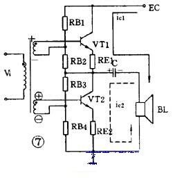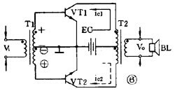 圖 5 是單管功率放大器, C1 是輸入電容, T 是輸出變壓器。它的集電極負載電阻 Ri′ 是將負載電阻 R L 通過變壓器匝數(shù)比折算過來的: RC′= ( N1 N2 ) 2 RL=N 2 RL 負載電阻是低阻抗的揚聲器,用變壓器可以起阻抗變換作用,使負載得到較大的功率。 這個電路不管有沒有輸入信號,晶體管始終處于導通狀,靜態(tài)電流比較大,困此集電極損耗較大,效率不高,大約只有 35 %。這種工作狀態(tài)被稱為甲類工作狀態(tài)。這種電路一般用在功率不太大的場合,它的輸入方式可以是變壓器耦合也可以是 RC 耦合。 ( 2 )乙類推挽功率放大器 圖 6 是常用的乙類推挽功率放大電路。它由兩個特性相同的晶體管組成對稱電路,在沒有輸入信號時,每個管子都處于截止狀態(tài),靜態(tài)電流幾乎是零,只有在有信號輸入時管子才導通,這種狀態(tài)稱為乙類工作狀態(tài)。當輸入信號是正弦波時,正半周時 VT1 導通 VT2 截止,負半周時 VT2 導通 VT1 截止。兩個管子交替出現(xiàn)的電流在輸出變壓器中合成,使負載上得到純正的正弦波。這種兩管交替工作的形式叫做推挽電路。